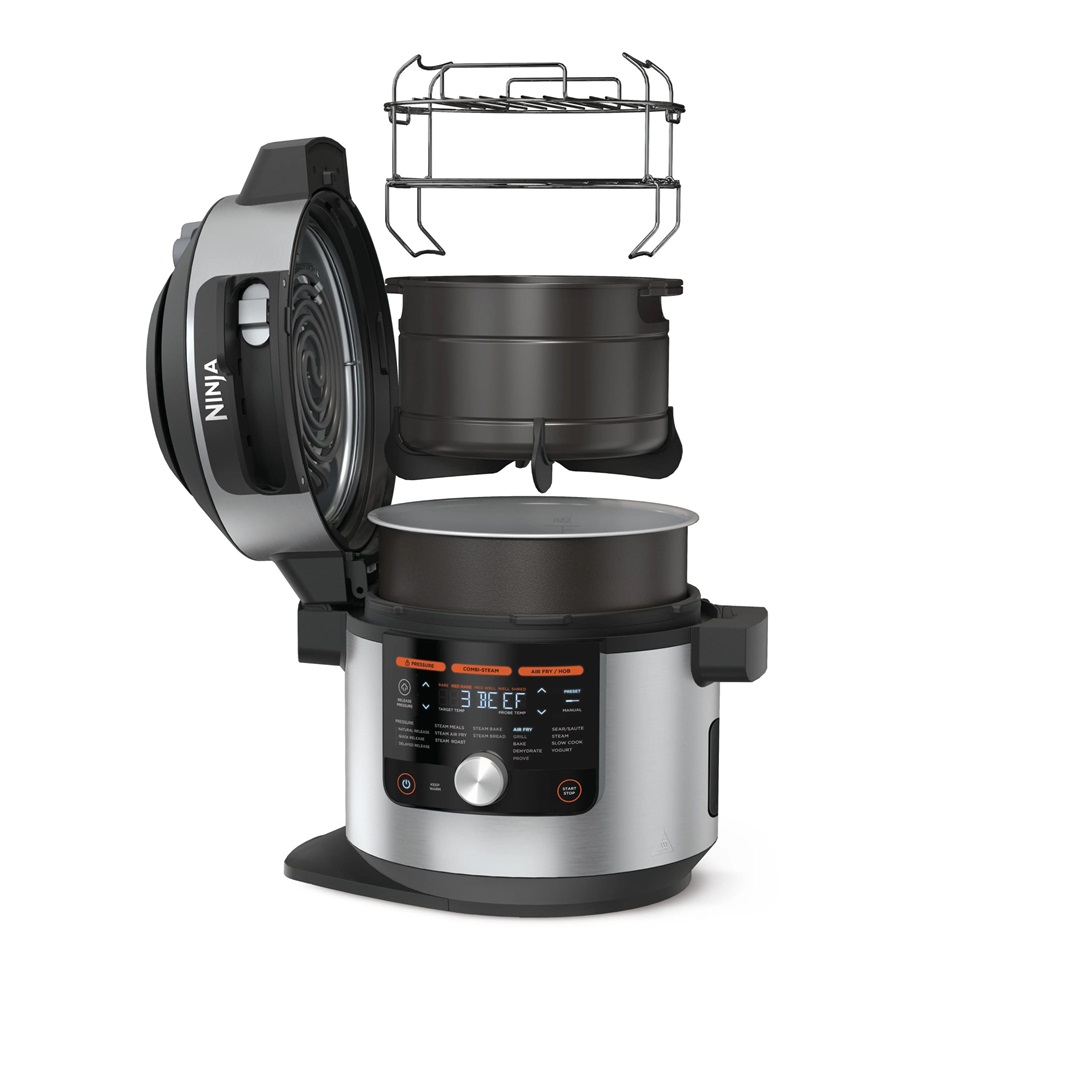 این دستگاه شامل یک قابلمه ۷.۵ لیتری با روکش سرامیکی نچسب مناسب پخت تا ۳ کیلوگرم گوشت، سبد Cook & Crisp با ظرفیت ۴.۷ لیتر و مناسب ۱.۸ کیلوگرم سیبزمینی سرخکرده، و قفسه دوطبقه قابلبرگشت است. این قفسه امکان پخت غذا در سه سطح مختلف، بخارپز کردن، پخت و گریل را بهصورت همزمان فراهم میکند.
